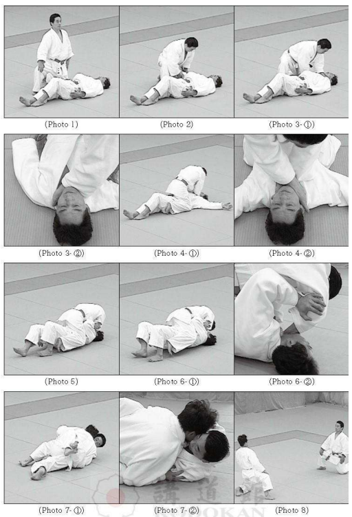 Mouvement 3 : Tori se penche sur le corps de Uke, il l’étrangle en tirant des deux mains et en les resserrant (Photo 5). Répondant à Tori, Uke tente de faire relâcher l’étranglement en poussant de la main droite vers le bas le coude gauche de Tori et en poussant vers le haut de la main gauche le coude droit de Tori (Photos 6- ①②). Tori saisit cette opportunité pour rouler sur sa gauche et contrôler Uke en maintenant son corps entre ses jambes et en croisant les pieds. Il accentue l’étranglement en tirant Uke à lui (Photos 7- ①②). Uke tente de s’échapper en mettant ses deux mains sur les coudes de Tori de la même manière que précédemment, mais il signale «Mairi» car il ne peut s’échapper.
