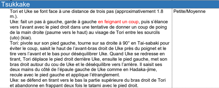 Tori et Uke se font face à une distance d’environ 1,8 m (environ 1 ken) (Photo 1). Uke lève son poing gauche au niveau de ses yeux, en pliant légèrement son bras gauche. Son poing droit est à la hauteur de son abdomen (Suigetsu). Il prend une position avec le pied gauche avancé (Photo 2). Il se rapproche de Tori avec son pied gauche en Tsugi-ashi. Après avoir feint de porter un coup avec son poing gauche (Photo 3), Uke fait immédiatement un grand pas en avant du pied droit et, en poussant un Kiai, il tente de frapper de son poing droit (le dos de la main vers le bas) Tori entre les sourcils (Uto) (Photo 4). Répondant à Uke, Tori tourne rapidement son corps vers sa droite, puis saisissant l’avant-bras droit de Uke avec sa main droite (Photo 5) il le tire vers le bas pour le déséquilibrer vers l’avant (Photo 6). Uke tente de retrouver son équilibre en se redressant. Tori, profitant de cette réaction, se positionne derrière Uke, en avançant le pied droit en premier, puis le gauche. Tout en se déplaçant, il fait glisser sa main droite sur le bras droit de Uke, puis la passe par-dessus l’épaule droite. Ensuite, il pose son avant-bras droit sur la gorge de Uke et le déséquilibre vers l’arrière (Photos 7- ①②). Tori accroche sa main droite avec sa main gauche au-dessus de l’épaule gauche de Uke (la main droite sur le dessus) (Photo 8) et étrangle Uke en «Hadakajime» en reculant son pied gauche pour prendre légèrement la position Jigo-tai (Photos 9- ①②) Uke tente de résister en saisissant avec sa main gauche le coude droit de Tori et avec sa main droite le haut du bras. Il signale «Mairi» en frappant 2 fois du pied le tatami pour abandonner quand il ne peut plus résister.