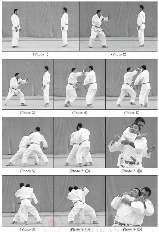 Tori et Uke se font face à une distance d’environ 1,8 m (environ 1 ken) (Photo 1). Uke lève son poing gauche au niveau de ses yeux, en pliant légèrement son bras gauche. Son poing droit est à la hauteur de son abdomen (Suigetsu). Il prend une position avec le pied gauche avancé (Photo 2). Il se rapproche de Tori avec son pied gauche en Tsugi-ashi. Après avoir feint de porter un coup avec son poing gauche (Photo 3), Uke fait immédiatement un grand pas en avant du pied droit et, en poussant un Kiai, il tente de frapper de son poing droit (le dos de la main vers le bas) Tori entre les sourcils (Uto) (Photo 4). Répondant à Uke, Tori tourne rapidement son corps vers sa droite, puis saisissant l’avant-bras droit de Uke avec sa main droite (Photo 5) il le tire vers le bas pour le déséquilibrer vers l’avant (Photo 6). Uke tente de retrouver son équilibre en se redressant. Tori, profitant de cette réaction, se positionne derrière Uke, en avançant le pied droit en premier, puis le gauche. Tout en se déplaçant, il fait glisser sa main droite sur le bras droit de Uke, puis la passe par-dessus l’épaule droite. Ensuite, il pose son avant-bras droit sur la gorge de Uke et le déséquilibre vers l’arrière (Photos 7- ①②). Tori accroche sa main droite avec sa main gauche au-dessus de l’épaule gauche de Uke (la main droite sur le dessus) (Photo 8) et étrangle Uke en «Hadakajime» en reculant son pied gauche pour prendre légèrement la position Jigo-tai (Photos 9- ①②) Uke tente de résister en saisissant avec sa main gauche le coude droit de Tori et avec sa main droite le haut du bras. Il signale «Mairi» en frappant 2 fois du pied le tatami pour abandonner quand il ne peut plus résister.