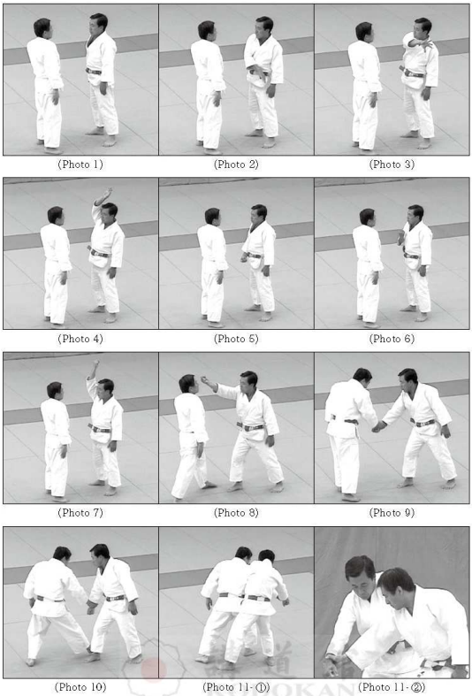 Après avoir terminé «Tsuki-age», Tori et Uke se font face (à environ deux pas) en Shizen-hontai. Tori se tient du côté droit et Uke du côté gauche en direction du Shomen (Photo 1). En écartant progressivement les quatre doigts et le pouce de sa main droite, avec son petit doigt vers le haut et le dos de la main face à lui, Uke déplace sa main droite vers le côté gauche en passant devant son corps et la soulève vers le haut en faisant un mouvement circulaire (Photos 2, 3). Lorsque son bras droit est étiré et que sa main droite arrive juste au-dessus de sa tête, Uke écarte complètement les quatre doigts et le pouce de sa main droite, puis tourne la paume vers le bas (Photo 4). Uke commence à serrer les doigts et le pouce tout en abaissant sa main droite à partir du côté droit dans un mouvement circulaire (Photo 5). En serrant fermement son poing devant son abdomen (le dos de la main vers l’avant), Uke soulève le poing droit vers le haut le long de sa poitrine pour étirer complètement son bras droit (Photos 6, 7). Uke fait un pas en avant avec son pied droit pour être légèrement en Jigo-tai à droite et tente de frapper le dessus de la tête de Tori (Tento) de la même manière qu’en «Kiri-oroshi» (Photo 8). Tori rentre son menton, tout en se penchant vers l’arrière et recule son pied droit d’abord, puis son pied gauche, il esquive l’attaque de Uke. Lorsque le poing de Uke passe devant son abdomen, Tori saisit le poignet droit de Uke par-dessus dans une saisie régulière (le dos de la main tournée vers le haut) (Photo 9), il avance son pied droit d’abord, puis son pied gauche en Tsugi-ashi et tente de déséquilibrer Uke vers le coin arrière droit en lui poussant la main droite (Photo 10). Répondant à Tori, Uke tourne vers sa droite en reculant son pied droit, retourne sa main gauche avec le bout des doigts tourné vers le bas pour mettre sa paume sur le coude droit de Tori par-devant en poussant Tori pour le faire pivoter avec amplitude sur son côté gauche (Photos 11- ①②).