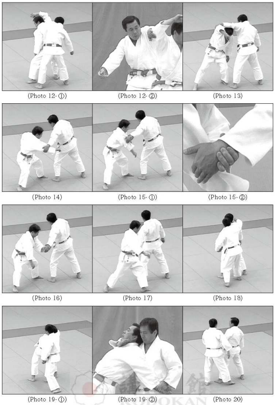 Répondant à Uke, Tori tourne avec amplitude vers sa gauche en se servant de son pied gauche comme pivot (Photos 12- ①②, 13). Tori déplace son pied droit en diagonale vers sa droite derrière Uke, il tire son coude droit vers sa droite pour déséquilibrer Uke vers son coin arrière gauche (de la même manière qu’en «Kiriorosi») (Photo 14). Tori saisit le poignet gauche de Uke avec sa main gauche audessus de son bras droit (le dos de la main vers le bas) (Photos 15- ①②) pour accentuer le déséquilibre vers le coin arrière gauche de Uke (Photo 16). Tori en déplaçant la position de ses pieds avec son pied gauche d’abord, puis son pied droit vers l’arrière de Uke. Tori se place derrière Uke (pendant cette séquence, sans relâcher le déséquilibre vers le coin arrière gauche) (Photos 17, 18). Tori passe son bras droit par-dessus l’épaule droite de Uke pour mettre son poignet droit sur la gorge de Uke avec une forme de «Hadaka-jime». Tori contrôle l’articulation du coude gauche de Uke en déplaçant avec amplitude son pied gauche derrière son pied droit en faisant glisser le poignet gauche de Uke vers le côté gauche de sa hanche (Photos 19- ①②). Uke signale «Mairi» en tapant légèrement l’extérieur de sa cuisse droite avec sa main droite. Tori relâche la technique et ramène Uke en Shizen-hontai (Photo 20).