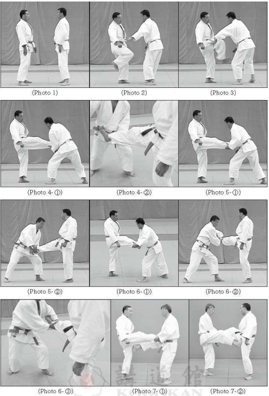Tori et Uke se font face à une distance d’environ un pas (Photo 1). Uke fait un petit pas vers l’avant avec son pied gauche et, en poussant un Kiai, il tente de donner un coup de pied sur le point vital de l’aine de Tori avec la plante de son pied droit (Photos 2, 3). Tori esquive le coup de pied de Uke en reculant son pied droit et en tournant son corps vers sa droite. Dans le même temps, Tori saisit la cheville droite de Uke de sa main gauche par l’extérieur (Photos 4- ①②) puis avec sa main droite (les mains presque face à face) (Photos 5- ①②), il déplace la jambe droite levée de Uke vers sa gauche (Photos 6- ①②③). Tori, en poussant un Kiai, donne un coup de pied avec la plante de son pied droit au point vital de l’aine de Uke en tournant les hanches vers la gauche (Photos 7- ①②).
