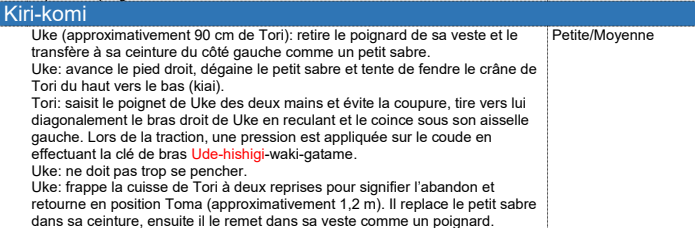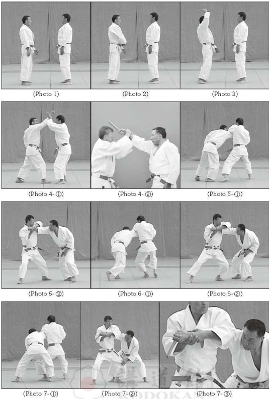 Tori et Uke se font face à une distance d’environ 90 cm (environ 3 jaku). Uke sort le poignard de sa veste avec sa main droite (en l’utilisant comme si c’était un sabre court) et le positionne dans sa ceinture sur le côté gauche de sa hanche (lame vers le haut) (Photo 1). Dégainant lentement le sabre court de son fourreau avec sa main droite, Uke fait un pas en avant avec son pied droit et, en poussant un Kiai, tente de frapper directement le front de Tori (Photos 2, 3). Répondant à Uke, Tori saisit avec ses deux mains le poignet droit de Uke (la main droite près du poignet et la main gauche en dessous) (Photos 4- ①②). Sans bloquer l’attaque, Tori recule son pied droit en tournant son corps vers sa droite (Photos 5- ①②). Il tire Uke pour le déséquilibrer en diagonale vers la droite (Photos 6- ①②). Tori contrôle le bras droit de Uke sous son aisselle gauche pour le verrouiller avec «Udehishigi-waki-gatame» (Photos 7 – ①②③). Uke signale “Mairi” en tapant avec sa main gauche deux fois sur la jambe gauche de Tori.