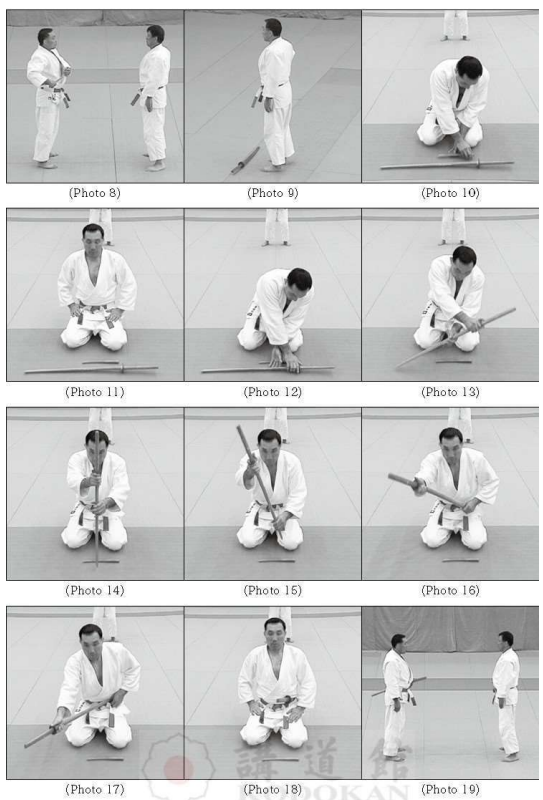 Lorsque «Kiri-komi» est terminé, Uke revient face à Tori, il met le sabre court dans son fourreau au niveau de sa hanche gauche, puis le remet dans sa veste (Photo 8). Ensuite, Uke se retourne et se dirige vers le sabre (Photo 9), il s’agenouille en Seiza, pose le poignard dans sa position initiale (Photos 10, 11). Uke positionne le sabre lame vers le haut) sur le côté gauche de sa hanche à l’intérieur de sa ceinture (Photos 12, 13, 14, 15, 16, 17, 18). Uke se relève et revient à la position face à Tori (Photo 19).