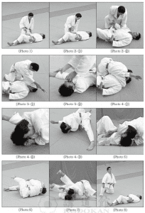 Mouvement 3 : Tori contrôle Uke en l’immobilisant et en serrant fermement avec les deux mains. Uke tente de s’échapper, par exemple, en * mettant sa paume gauche sur son poing droit en poussant avec ses deux coudes pour relâcher le contrôle de Tori (Photo 5). * tournant son corps vers la droite et en insérant son genou droit sous la hanche de Tori (Photo 6). * roulant vers l’arrière sur son épaule gauche (Photo 7). Uke signale enfin “Mairi” quand il ne peut échapper au contrôle de Tori.
