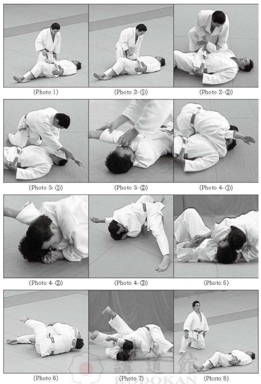 Mouvements 1 et 2 : Tori part de la de distance Chikama et avance légèrement (Photo 1), il soulève le bras droit de Uke de ses deux mains (en mettant sa main gauche sur le bras de Uke, quatre doigts vers le haut et en saisissant le poignet de Uke de la main droite, quatre doigts vers le bas) (Photos 2- ① ②). Tori déplace son genou droit vers l’avant tout en contrôlant Uke. En poussant de la main gauche le coude droit de Uke vers l’oreille droite de Uke, il place sa rotule droite contre le côté droit du corps de Uke tout en relevant les orteils de son pied droit (Photos 3- ① ②). Il passe la main droite au-dessus de l’épaule gauche de Uke jusqu’au côté droit du cou de Uke en passant derrière le cou. Tout en plaçant le côté droit de son cou contre le bras droit de Uke à l’endroit où sa main gauche poussait précédemment, il pousse le bras contre la joue droite de Uke pour contrôler le bras droit de Uke. Puis, Tori accroche sa main droite tendue sous le cou de Uke avec sa main gauche tout en plaçant sa main droite sur le dessus. Il allonge la jambe gauche vers son côté gauche pour stabiliser ses jambes (Photos 4- ① ② ③).