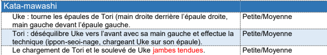 Répondant à la rotation de Uke, Tori se tourne vers sa gauche en changeant ses pas, du pied gauche vers le pied droit, puis vers le pied gauche pour faire face à Uke, il déplace sa main gauche, avec l’auriculaire vers le haut et sa paume face à Uke, vers le haut du bras droit à l’avant de l’épaule droite de Uke, il saisit le haut du bras de Uke près de l’intérieur du coude droit, (la main gauche de Uke va naturellement vers le bas). Tori recule légèrement avec son pied gauche et, en déséquilibrant Uke vers l’avant avec sa main gauche (Photos 7, 8- ①②), il déplace son pied droit vers l’avant et l’intérieur du pied droit de Uke (Photo 9). En abaissant son corps, Tori déplace son pied gauche vers l’avant et l’intérieur du pied gauche de Uke, il insère son épaule droite sous l’aisselle droite de Uke (Photos 10, 11), il glisse sa main droite sous l’aisselle droite de Uke et la place sur l’épaule droite de Uke (Photos 12- ①②) pour le contrôler sous la forme de «Ippon-seoi-nage» à droite (Photos 13, 14). Uke place la paume de sa main gauche, le bout des doigts vers le bas, sur le côté gauche de la hanche de Tori, il tend ses deux jambes tout en les maintenant ensemble. Après s’être penché complètement en arrière et avoir soulevé son corps, Uke signale «Mairi» en tapant légèrement le côté gauche de la hanche de Tori avec sa main gauche. Tori relâche la technique et redescend Uke (Photos 15, 16).