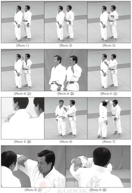 Tori et Uke se tiennent à l’endroit où ils ont terminé «Ryote-dori» (Tori se tient devant Uke à une courte distance avec le côté gauche vers Shomen) en Shizen-hontai (Photo 1). Uke lève ses deux mains le long de son corps (de la même manière qu’en «Kataoshi») (Photos 2, 3, 4- ①②), il pose sa main droite sur le côté arrière de l’épaule droite de Tori et sa main gauche sur le côté avant de l’épaule gauche de Tori (Photos 5- ①②), il pousse avec sa main droite et tire avec sa main gauche pour tourner Tori vers la gauche (Photo 6).