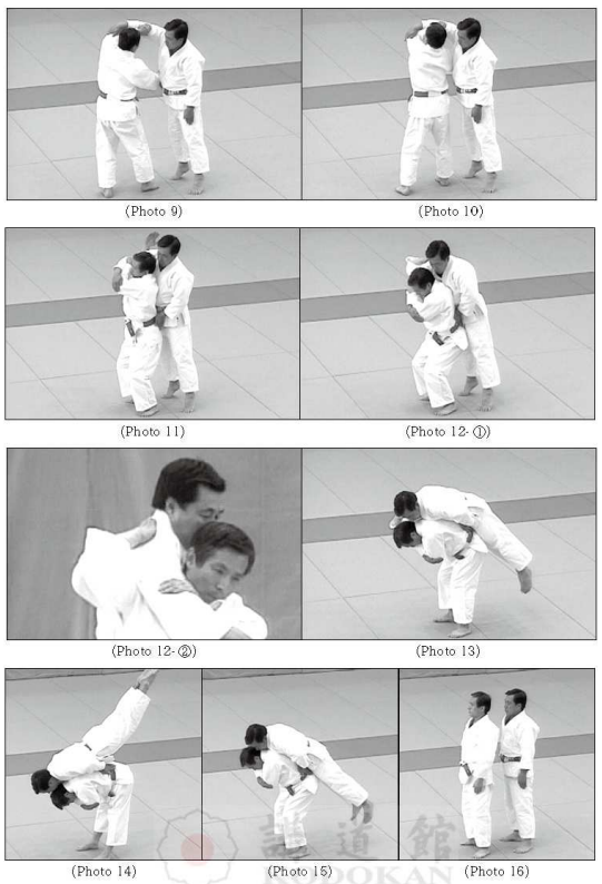 Répondant à la rotation de Uke, Tori se tourne vers sa gauche en changeant ses pas, du pied gauche vers le pied droit, puis vers le pied gauche pour faire face à Uke, il déplace sa main gauche, avec l’auriculaire vers le haut et sa paume face à Uke, vers le haut du bras droit à l’avant de l’épaule droite de Uke, il saisit le haut du bras de Uke près de l’intérieur du coude droit, (la main gauche de Uke va naturellement vers le bas). Tori recule légèrement avec son pied gauche et, en déséquilibrant Uke vers l’avant avec sa main gauche (Photos 7, 8- ①②), il déplace son pied droit vers l’avant et l’intérieur du pied droit de Uke (Photo 9). En abaissant son corps, Tori déplace son pied gauche vers l’avant et l’intérieur du pied gauche de Uke, il insère son épaule droite sous l’aisselle droite de Uke (Photos 10, 11), il glisse sa main droite sous l’aisselle droite de Uke et la place sur l’épaule droite de Uke (Photos 12- ①②) pour le contrôler sous la forme de «Ippon-seoi-nage» à droite (Photos 13, 14). Uke place la paume de sa main gauche, le bout des doigts vers le bas, sur le côté gauche de la hanche de Tori, il tend ses deux jambes tout en les maintenant ensemble. Après s’être penché complètement en arrière et avoir soulevé son corps, Uke signale «Mairi» en tapant légèrement le côté gauche de la hanche de Tori avec sa main gauche. Tori relâche la technique et redescend Uke (Photos 15, 16).