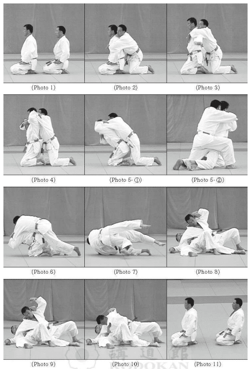 Uke se relève à la distance de Toma (environ 1,2 m), il se déplace, en passant par la droite de Tori et s’agenouille derrière lui à la distance d’un pas. Il glisse sur les genoux vers l’avant à la distance de Chikama (environ 20 cm ou 7 sun) (Photo 1). Soulevant ses hanches et relevant les orteils de ses deux pieds, Uke lève son genou droit et fait un pas en avant sur le côté droit de Tori, en poussant un Kiai, il entoure les bras de Uke avec ses deux bras en positionnant sa tête sur sa gauche. (Photo 2). Répondant à Uke, Tori écarte les bras vers l’extérieur (Photo 3), puis il contrôle le bras gauche de Uke, avec sa main gauche en haut du bras et sa main droite au niveau du poignet. Tori soulève ses hanches et relève ses orteils (Photo 4). Tori déplace sa jambe droite vers l’arrière pour la glisser loin entre les jambes de Uke (Photos 5- ①②), Tori enroule Uke sur son épaule gauche avec la forme de «Seoi-nage» (Photos 6, 7), il contrôle le corps de Uke avec son aisselle et le bras droit en forme de «Ushiro-kesa-gatame» (Photo 8), Tori frappe du poing gauche le point vital de l’aine de Uke en poussant un Kiai. (Photos 9, 10). Uke retourne à sa position initiale (derrière Tori) (Photo 11), s’agenouille, puis se relève pour revenir face à Tori. Il s’agenouille en Seiza à la distance de Toma (environ 1,2 m), se relève et se dirige en direction du poignard.