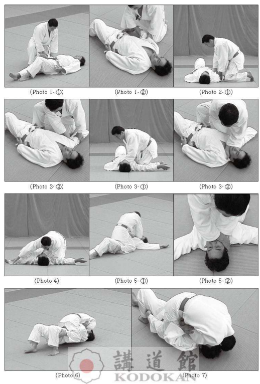 Mouvement 2 : Tori de la distance Chikama avance légèrement, il tient le bras droit de Uke des deux mains, (la main gauche, quatre doigts vers le bas et il saisit le poignet de Uke de la main droite, quatre doigts vers le haut) (Photos 1- ①②) puis, le déplace sur son côté gauche (Photos 2- ①②). Tori se rapproche pour saisir en profondeur le col gauche de Uke de la main gauche dans une saisie inversée (les quatre doigts à l’intérieur) (Photos 3- ①②), il chevauche le corps de Uke tout en poussant de la main droite le bras gauche de Uke et en contrôlant le corps de Uke avec ses deux jambes (Photo 4). Tori déplace ensuite sa main droite en passant au-dessus de la tête de Uke pour saisir en profondeur le côté droit du col de Uke en une saisie régulière (le pouce à l’intérieur) et croise ses deux mains sur la gorge de Uke (Photos 5- ①②).