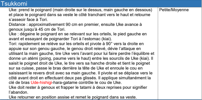Uke se met à genoux devant le sabre et le poignard (Photo 1), il insère le poignard (lame vers le haut) à l’intérieur de sa veste et retourne à sa position initiale pour s’agenouiller en Seize face à Tori à une distance d’environ 45 cm (environ 1 shaku 5 sun) (Photo 2). Uke appuie sur le fourreau avec sa main gauche sur sa veste, il sort le poignard (lame vers le haut) avec sa main droite, tout en soulevant ses hanches et en relevant les orteils de son pied droit. Uke fait un pas en avant avec son pied gauche et, en poussant un Kiai, tente de poignarder Tori au niveau de l’abdomen (Suigetsu) (Photos 3, 4). Répondant à Uke, Tori relève les orteils de son pied gauche, esquive le coup de couteau de Uke en relevant le genou droit et pivote sur son genou gauche pour tourner son corps vers la droite. Il chasse de sa main gauche, vers l’avant, (le quatre doigts vers le bas) le bras droit de Uke (juste au-dessus du coude) et le déséquilibre dans cette direction. Dans un même temps, en poussant un Kiai, il frappe Uke entre les sourcils (Uto) avec son poing droit (dos de la main vers le bas) (Photos 5- ①②). Puis Tori saisit de sa main droite le poignet droit de Uke par-dessus et le tire en direction de sa hanche droite (le dos de la main droite de Uke vers le haut) pour le coller sur sa cuisse droite (Photos 6- ①②). Dans le même temps Tori passe pardessus l’épaule gauche de Uke en saisissant le plus loin possible le revers droit de Uke avec sa main gauche pour contrôler son cou (Photo 7). Tori verrouille l’articulation du coude droit de Uke avec «Udehishigi-hara-gatame» (Photos 8- ①②③). Uke signale “Mairi” en tapant de sa main gauche deux fois sur le Tatami. Uke insère le poignard dans sa veste, puis revient dans la position initiale pour s’agenouiller en Seiza face à Tori.