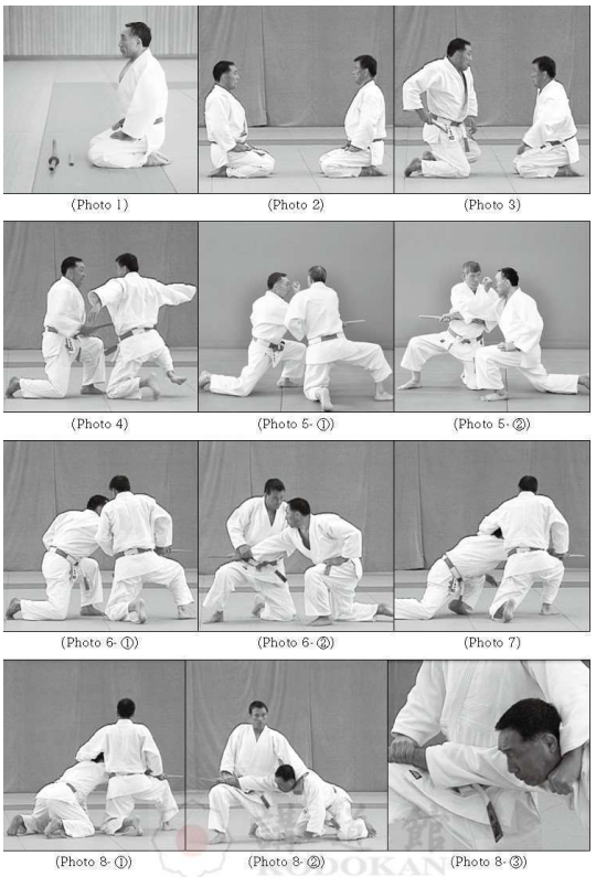 Uke se met à genoux devant le sabre et le poignard (Photo 1), il insère le poignard (lame vers le haut) à l’intérieur de sa veste et retourne à sa position initiale pour s’agenouiller en Seize face à Tori à une distance d’environ 45 cm (environ 1 shaku 5 sun) (Photo 2). Uke appuie sur le fourreau avec sa main gauche sur sa veste, il sort le poignard (lame vers le haut) avec sa main droite, tout en soulevant ses hanches et en relevant les orteils de son pied droit. Uke fait un pas en avant avec son pied gauche et, en poussant un Kiai, tente de poignarder Tori au niveau de l’abdomen (Suigetsu) (Photos 3, 4). Répondant à Uke, Tori relève les orteils de son pied gauche, esquive le coup de couteau de Uke en relevant le genou droit et pivote sur son genou gauche pour tourner son corps vers la droite. Il chasse de sa main gauche, vers l’avant, (le quatre doigts vers le bas) le bras droit de Uke (juste au-dessus du coude) et le déséquilibre dans cette direction. Dans un même temps, en poussant un Kiai, il frappe Uke entre les sourcils (Uto) avec son poing droit (dos de la main vers le bas) (Photos 5- ①②). Puis Tori saisit de sa main droite le poignet droit de Uke par-dessus et le tire en direction de sa hanche droite (le dos de la main droite de Uke vers le haut) pour le coller sur sa cuisse droite (Photos 6- ①②). Dans le même temps Tori passe pardessus l’épaule gauche de Uke en saisissant le plus loin possible le revers droit de Uke avec sa main gauche pour contrôler son cou (Photo 7). Tori verrouille l’articulation du coude droit de Uke avec «Udehishigi-hara-gatame» (Photos 8- ①②③). Uke signale “Mairi” en tapant de sa main gauche deux fois sur le Tatami. Uke insère le poignard dans sa veste, puis revient dans la position initiale pour s’agenouiller en Seiza face à Tori.