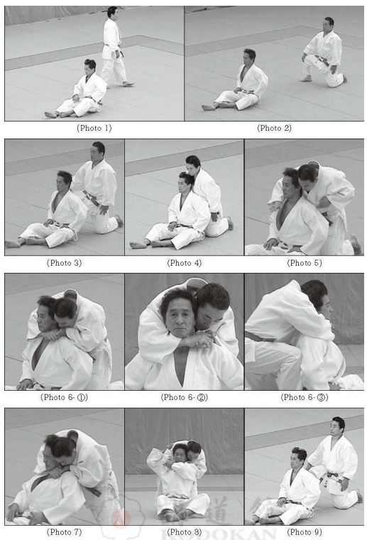 Mouvement 3 : Abaissant son corps pour reculer son pied gauche, Tori déséquilibre Uke vers l’arrière pour l’étrangler en tirant fermement des deux mains (Photo 7). Uke tente de s’échapper en saisissant le bras droit de Tori des deux mains en l’abaissant (Photo 8), mais il signale «Mairi» car il ne peut pas s’échapper. Mouvement 4: Tori relâche son étranglement et recule à la distance Chikama pour prendre la posture Kyoshi (Photo 9).