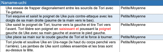 Après avoir terminé «Ryokata-oshi», Tori et Uke reviennent au centre et se positionnent face à face (à une distance d’environ un pas) dans la posture Shizenhontai. Tori se tient du côté droit et Uke du côté gauche face au Shomen (Photo 1). Uke tend les doigts et le pouce de sa main droite serrés, il plie son coude droit pour lever sa main droite au-dessus de son épaule gauche (Photo 2) et tente de frapper le Uto de Tori avec Te-gatana de sa main droite (le bout de l’auriculaire frappe le Uto de Tori) (Photos 3- ①②). Lorsque Uke attaque Te-gatana de la main droite en le touchant pratiquement, Tori esquive l’attaque en penchant le haut de son corps vers l’arrière. Tori contrôle Uke en lui saisissant le poignet droit de l’intérieur avec ses doigts de la main gauche tournés vers le haut, avec un mouvement de la main en diagonale vers le bas par rapport à la gauche de Tori (Photos 4- ①②). Puis, Tori tend les doigts et le pouce de sa main droite serrés, la paume tournée vers le bas (Photo 5) et il tente d’attaquer le Uto de Uke en avançant de son pied droit (Photo 6). Uke fait un pas en arrière avec son pied gauche pour se tourner vers sa gauche, il saisit le poignet droit de Tori de l’intérieur avec le dos de la main gauche vers le haut pour le tirer dans la direction de l’attaque et tente de le déséquilibrer vers l’avant (Photos 7- ①②). Tori fait un pas en avant de son pied gauche, libère sa main gauche, saisit le poignet gauche de Uke avec sa main gauche, les quatre doigts vers le haut et tente de le déséquilibrer dans la direction avant gauche de Uke, (pendant cette séquence, la main droite de Tori est libérée de la saisie de la main gauche de Uke) (Photos 8, 9).