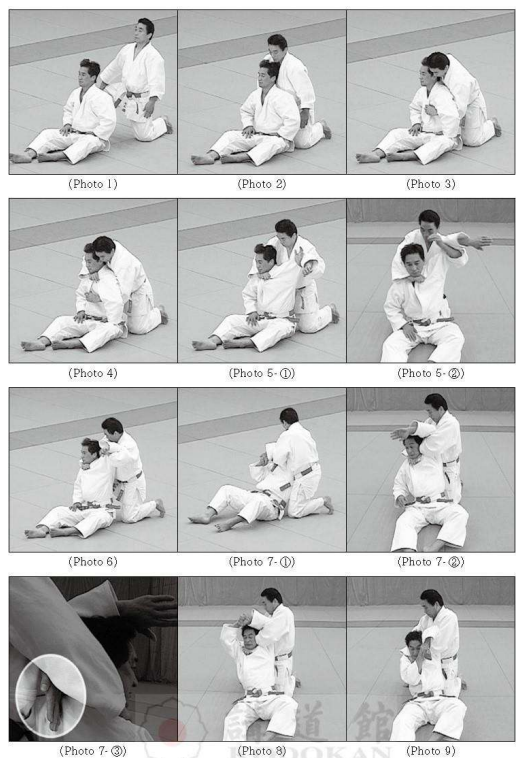 Mouvement 3 : Tori déséquilibre Uke vers l’arrière en accrochant son bras gauche au niveau du coude et en le soulevant pour le contrôler après l’avoir tiré sur son côté gauche (Photos 5- ①②). Tori tourne la paume de sa main gauche vers l’intérieur, en tendant le bout des doigts, il glisse sa main gauche sous son bras droit en passant par-dessus l’épaule gauche de Uke (Photo 6) et l’étrangle en tirant avec sa main droite et en tournant légèrement son corps vers sa droite (Photos 7- ① ② ③). Uke tente de s’échapper en saisissant son poignet gauche de la main droite pour abaisser son bras gauche (Photos 8, 9), mais il signale «Mairi» car il ne peut pas s’échapper.