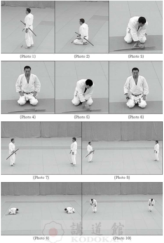 Uke se retourne et se dirige en direction du poignard (Photo 1). Il s’agenouille en Seiza (Photo 2) et pose le sabre dans sa position initiale (Photos 3, 4). Ensuite, Uke prend ensemble, le poignard et le sabre avec sa main droite (les deux lames vers le haut) (Photos 5, 6), il se relève et se retourne pour revenir à sa position de départ (à l’endroit où ils ont débuté Kiri-oroshi). Au cours de cette séquence, Tori revient également à la même position (Photo 7). Debout, Tori et Uke font un pas en arrière (Photo 8), s’agenouillent face à face, Uke dépose le poignard et le sabre sur son côté droit puis se saluent à genoux (Photo 9). Après le salut, Tori et Uke se relèvent, se tournent pour faire face au Shomen et saluent debout simultanément (Photo 10).