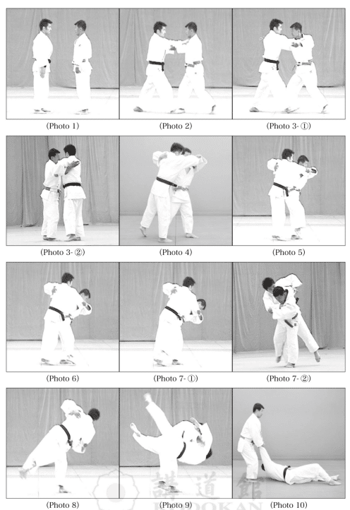 Phase 3: Tori place le pied gauche derrière son pied droit, pivote sur le pied gauche tout en tirant Uke avec les deux mains. Cette action fait déplacer le pied droit de Uke légèrement vers l’avant et le déséquilibre en diagonale vers l’avant droit (Photo 4). Tori colle fermement sa hanche droite contre l’abdomen de Uke (Photo 5) et projette Uke en le balayant, faisant glisser sa jambe droite le long de la jambe droite de Uke (Photos 6, 7 – ①②, 8, 9, 10).