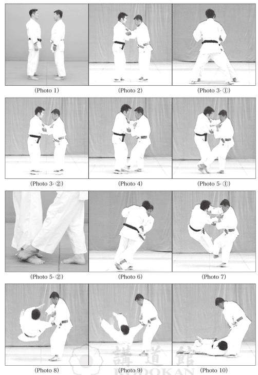 Phase 3: Tori fait un grand pas vers la droite avec le pied droit tout en soulevant le corps de Uke vers le haut et vers la gauche. Tori fait avec les deux mains une action en forme d’arc de cercle (Photo 4). Tori tourne la plante du pied gauche tout en concentrant sa force sur le petit orteil du pied gauche, balaie sous la cheville droite de Uke avec la plante du pied gauche (Photos 5 – ① ②) et projette Uke dans le prolongement de la direction du déplacement (Photos 6, 7, 8, 9,10).