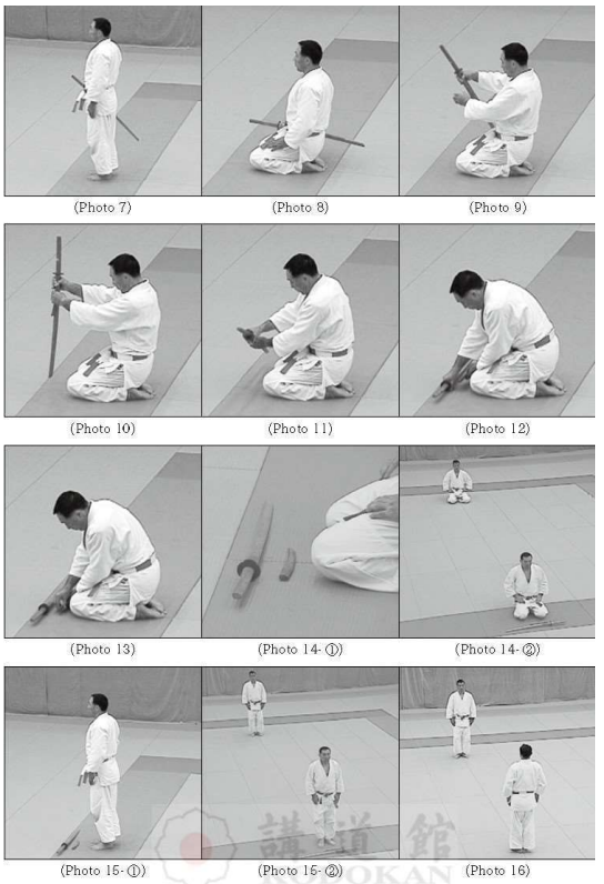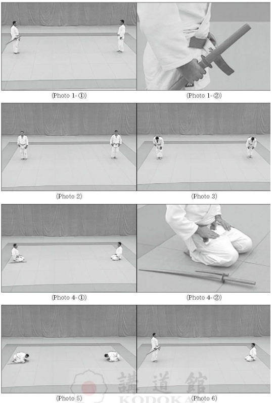 Tori se tient du côté gauche et Uke du côté droit face au Shomen, Uke tient un sabre et un poignard de la main droite (la pointe du sabre vers le bas à environ 45 °). (Le sabre est placé à l’extérieur, la lame du sabre et du poignard vers le haut, la base de la poignée du poignard est posée contre le bas de la garde du sabre). En position debout à une distance d’environ 5,4 m (environ 3 ken) (Photos 1- ①②). Les deux font face au Shomen pour faire simultanément le salut debout (Photos 2, 3) et s’agenouillent face à face. Uke dépose le sabre et le poignard sur son côté droit (le sabre à l’extérieur, le poignard à l’intérieur, la base de la poignée du poignard est alignée avec la garde du sabre, les lames tournées vers l’intérieur) (Photos 4- ①②). Les deux font le salut à genoux (Photo 5).