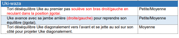 Tori est du côté droit face au Shomen, Uke est à gauche. Ils se font face et sont à la bonne distance. Puis, Tori et Uke se saisissent en Hidari-jigo-tai pour exécuter «Uki-waza» de la même manière que précédemment en projetant Uke en direction de son épaule droite tout en déplaçant la jambe droite en diagonale vers sa droite et en lançant son corps sur son côté droit.