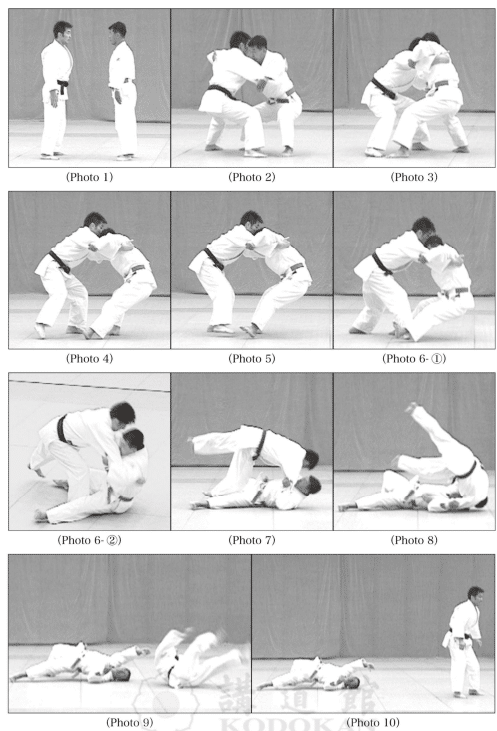 Phase 3: Au cours de cette séquence, Tori étire légèrement la jambe gauche tout en déséquilibrant Uke vers le coin avant droit en utilisant avec efficacité les deux mains (Photo 5). Tori projette Uke en direction de son épaule gauche tout en déplaçant la jambe gauche en diagonale vers sa gauche et en lançant son corps sur son côté gauche (Photos 6 – ①②, 7, 8, 9, 10).