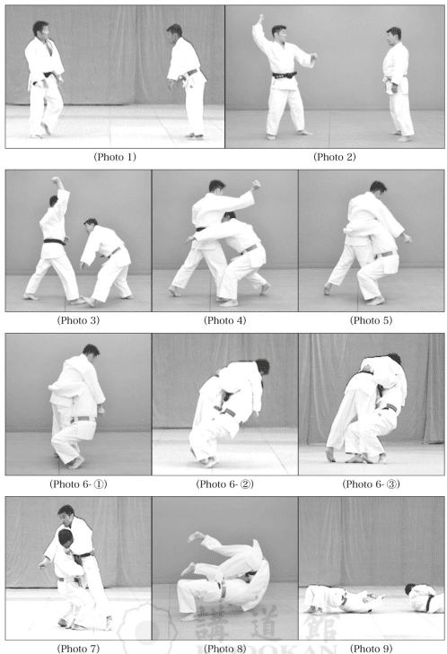 Phase 2: Tori saisit cette opportunité, avance le pied gauche loin derrière le pied droit de Uke pour passer sous le bras de Uke (Photo 5) et abaisse les hanches, tandis que le poing droit de Uke frappe dans le vide au-dessus de l’épaule gauche. Tori place le bras gauche, au niveau de la ceinture de Uke, le plus loin possible et le tire à lui pour maintenir fermement les hanches de Uke contre son corps. Tori déplace le pied droit en un seul mouvement rapide vers l’intérieur du pied droit de Uke et place la paume de sa main droite (doigts vers le haut) sur l’abdomen de Uke (Photos 6 – ①②③). Tori projette Uke par- dessus l’épaule gauche en se penchant en arrière pour soulever le corps de Uke en utilisant les deux mains et les hanches et en lançant son corps en arrière (Photos 7, 8, 9).